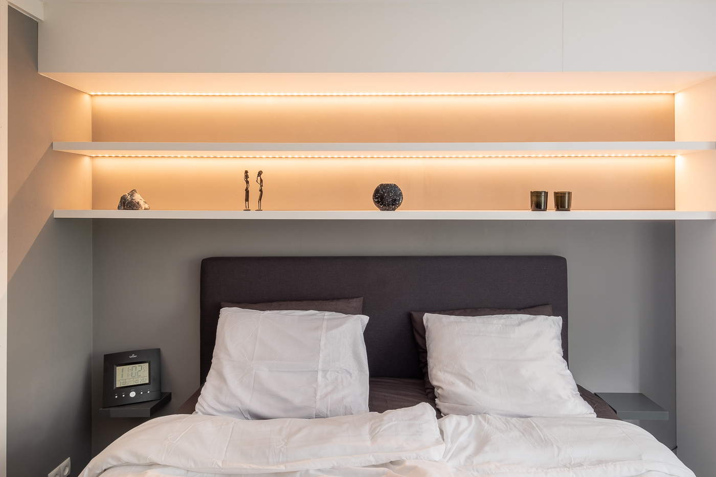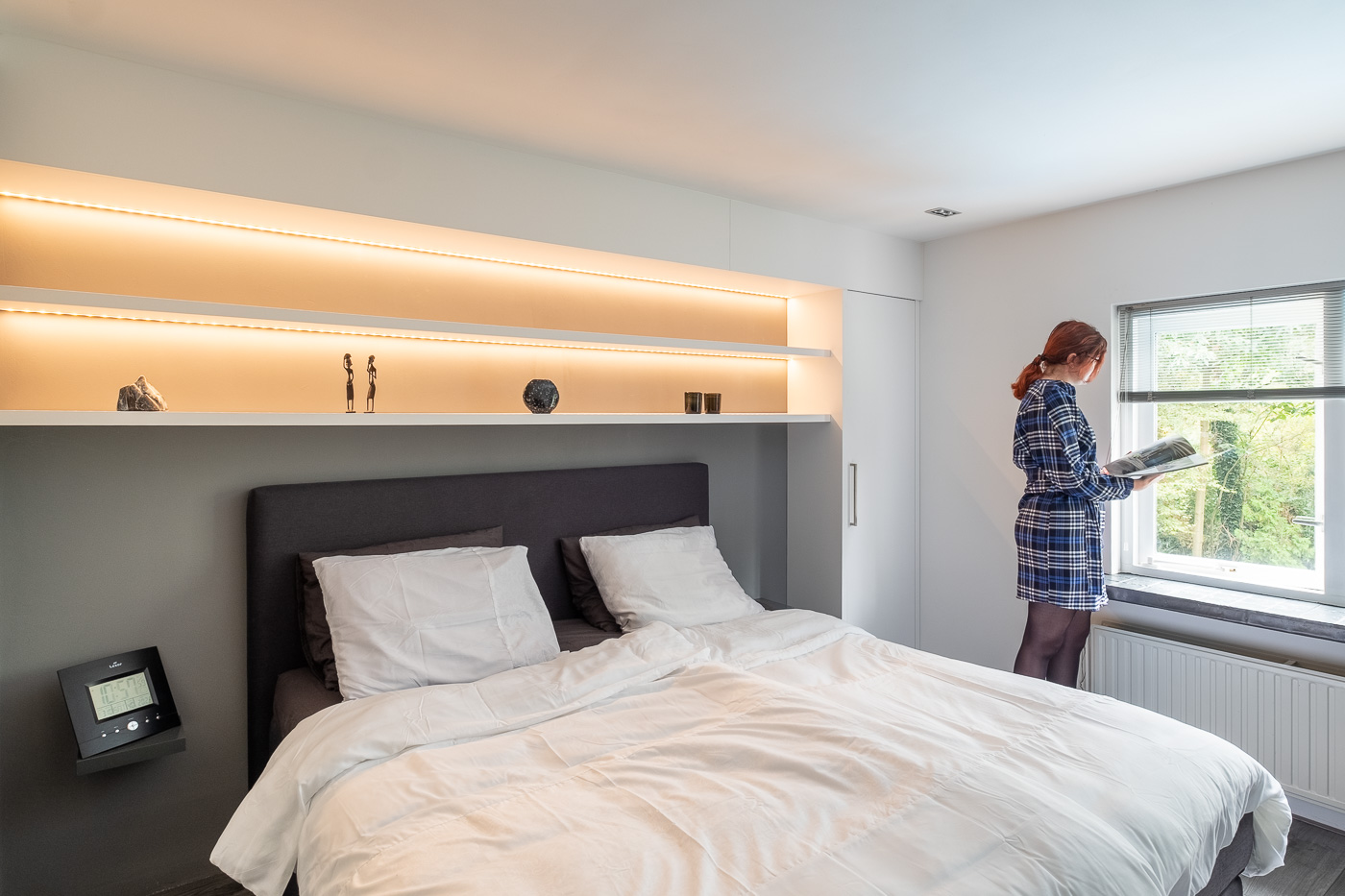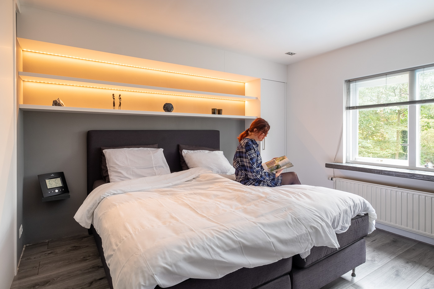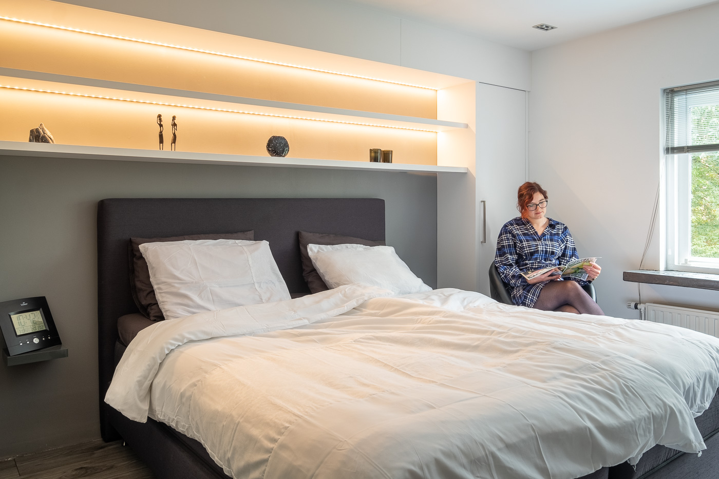 Voor een familie in Wezep heeft Comfort Meubel een fraaie slaapkamer ingericht met bergruimte en sfeervolle verlichting. Na een advies over de kleur en te gebruiken materialen zijn er stalen aangegvraagd. Door de koof en de planken is er een verbinding gemaakt tussen de beide opbergkasten. Door middel van de dual-white LED strips is de verlichting in te stellen van koel- naar warm-wit.