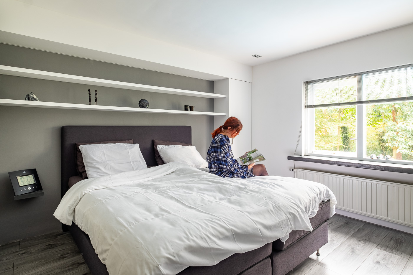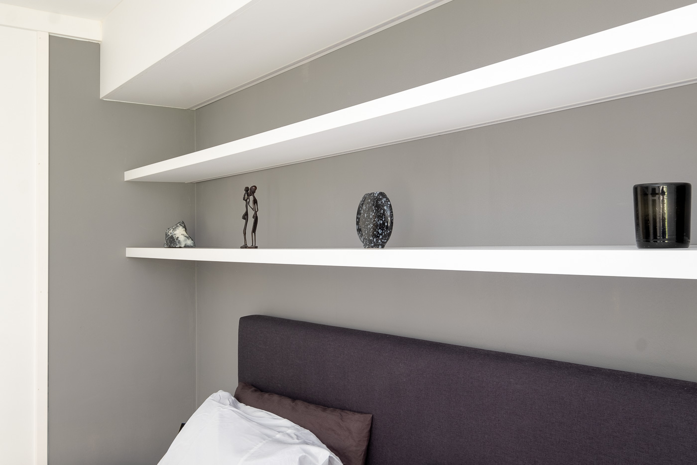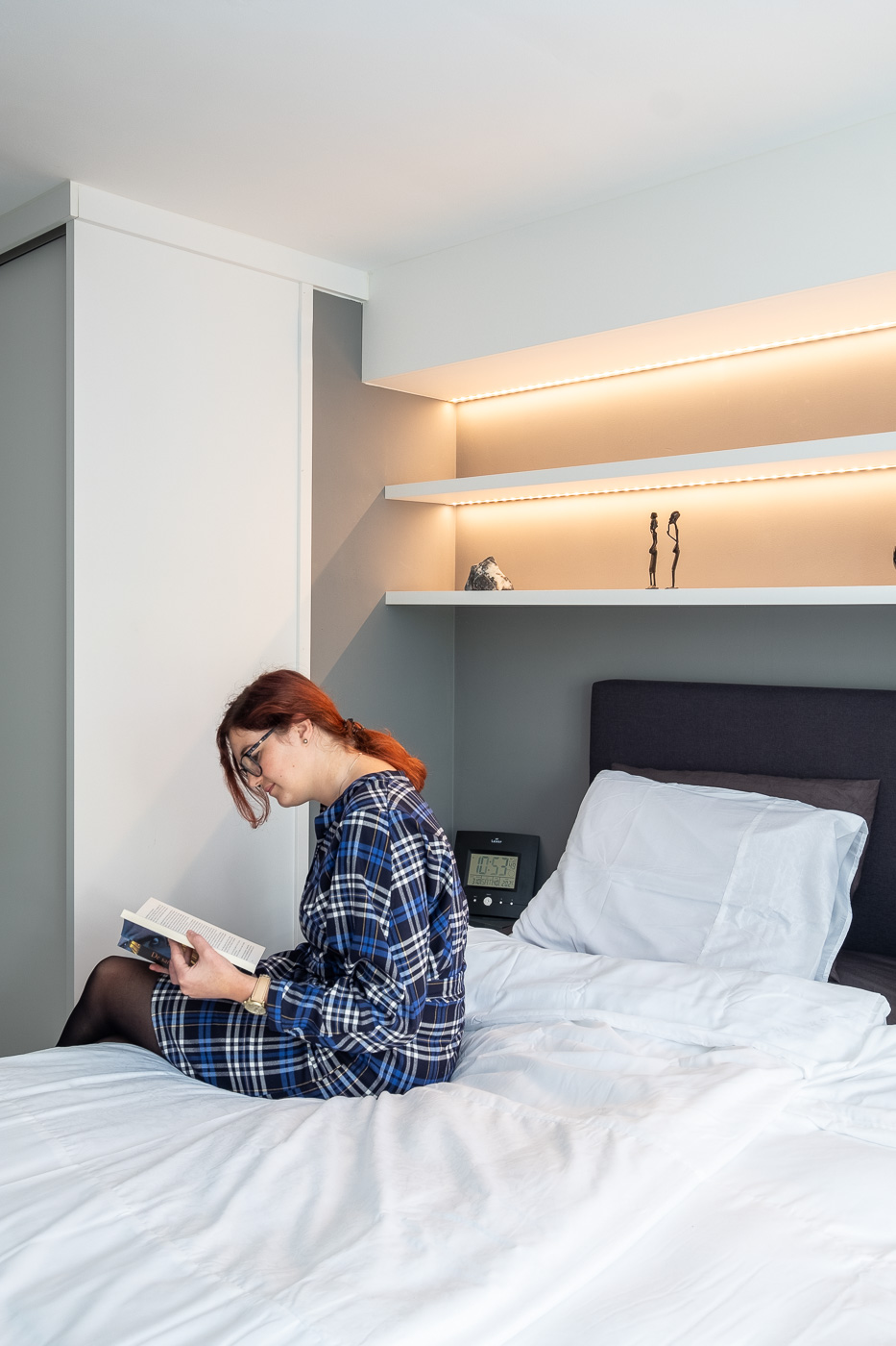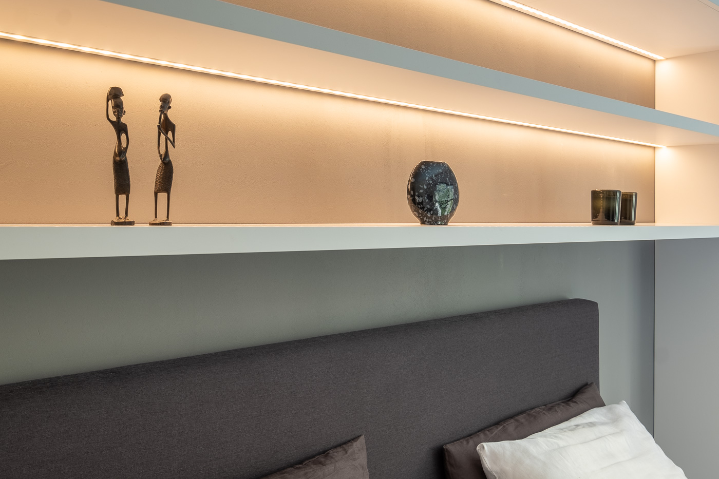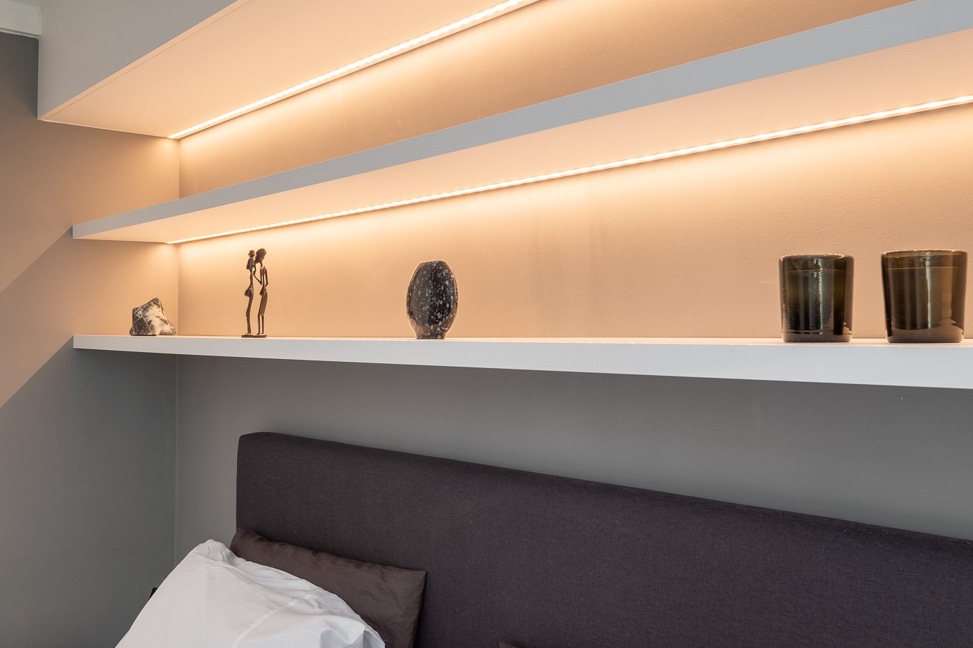 Voor een familie in Wezep heeft Comfort Meubel een fraaie slaapkamer ingericht met bergruimte en sfeervolle verlichting. Na een advies over de kleur en te gebruiken materialen zijn er stalen aangegvraagd. Door de koof en de planken is er een verbinding gemaakt tussen de beide opbergkasten. Door middel van de dual-white LED strips is de verlichting in te stellen van koel- naar warm-wit.